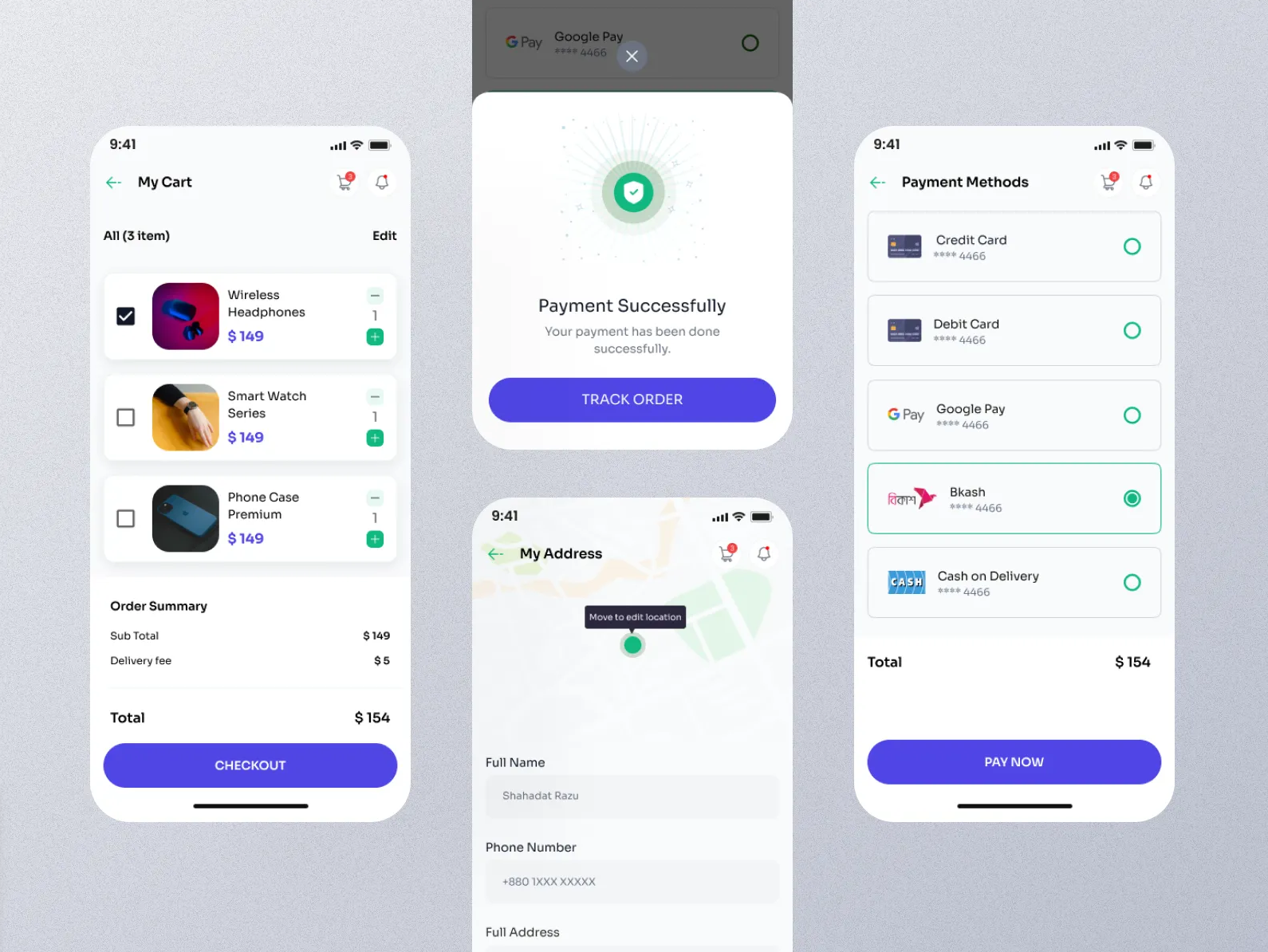 Some baskets require multiple steps, but the flow feels long only when users can't see progress. The Checkout Process Mobile App Design concept offers a crisp example of a guided, multi-step path from cart to confirmation. Each screen has one job, and the user always knows what's next.