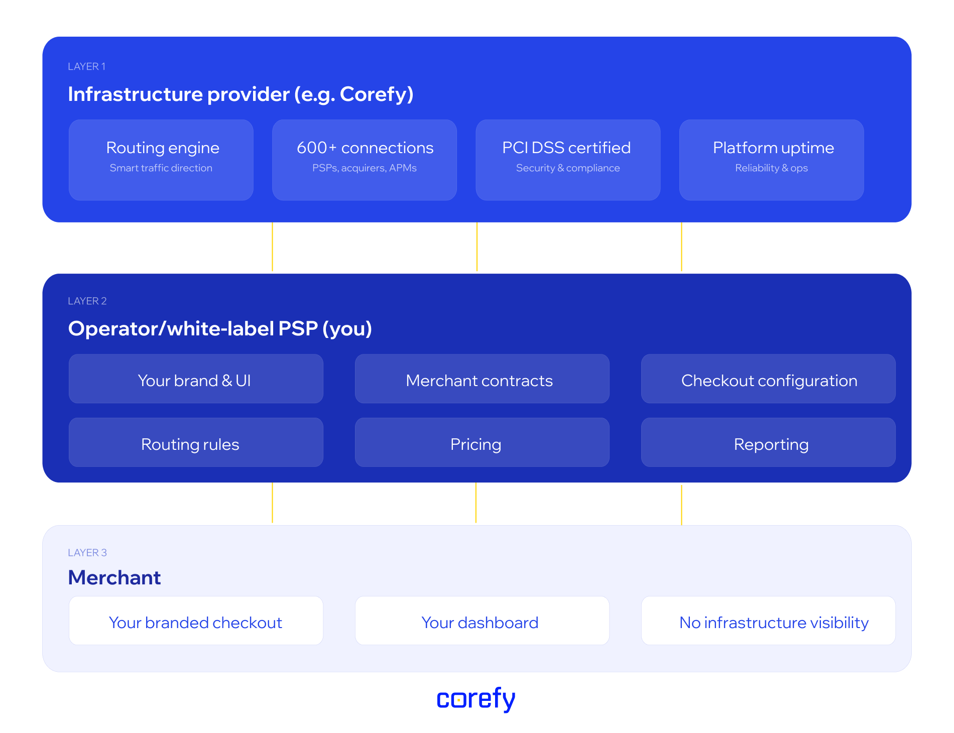 | Provider integrations | Built and maintained by your team, one by one | Inherited from the provider's network (600+ in Corefy's case) |