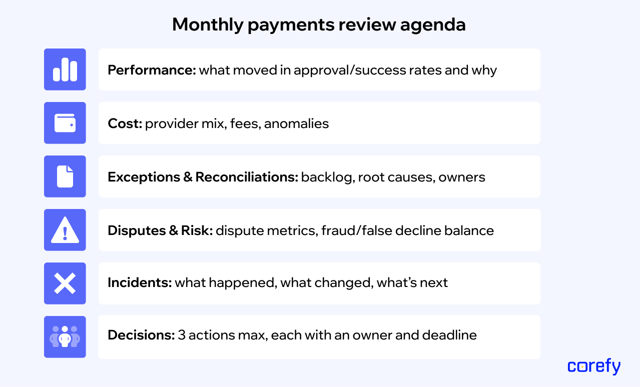 What a Payment Manager changes: They make volatility measurable and explainable. Expect a weekly performance pack segmented by provider/method/market, a standard decline taxonomy, and a routine for turning anomalies into actions (provider escalation, routing changes, 3DS tuning, checkout fixes). They’ll also define what ‘good’ means and put an owner on it — not as a one-off dashboard, but as an operating cadence.